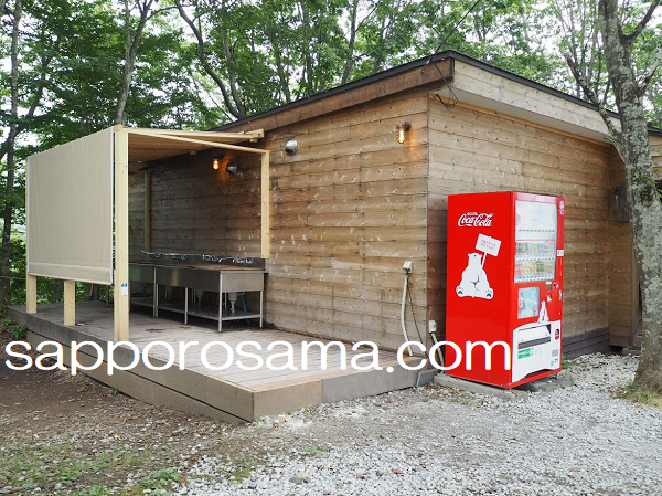 トイレ、シャワーなどがある建物の外側に水場があり、食器洗いなどはこちらを利用します。お湯が出るのがとてもありがたいです。写真にも写っていますが飲み物の調達がイマイチだった我が家は自動販売機もありありがたく利用させていただきました。続いてシャワー室の様子。シャワー室は全部で4室ありました。(男女それぞれに4基ずつ)