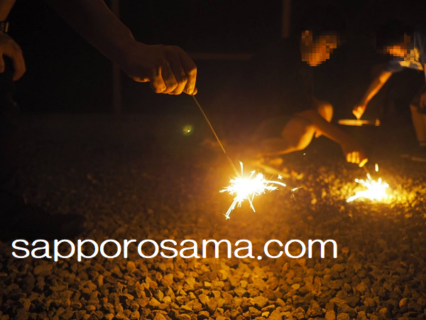 さて、今回のキャンプ、私は全く料理をする気がありません。夏休み、毎日3食子どもたちの食事を用意する生活。キャンプの時くらい夫が食事当番をしても罰は当たらないはずです(笑)。火をおこし、ジンギスカンや豚串などを焼いて食べました。 食後は花火。 センタハウス横の決められた場所で花火OKだったので利用しました。